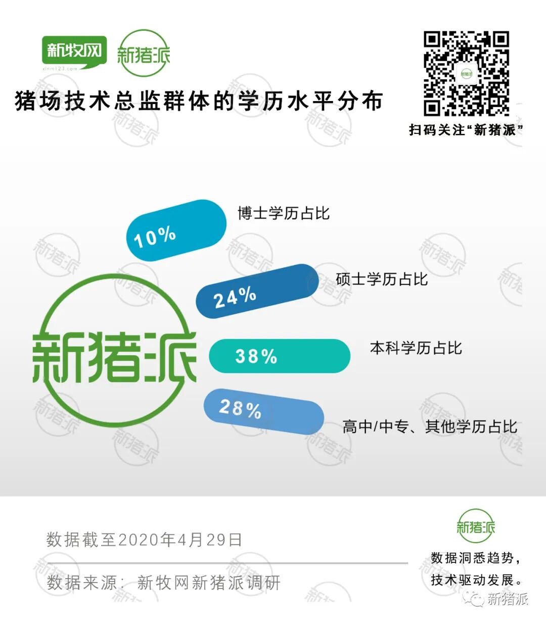 温氏股份陈峰是硕士研究生学历,牧原股份李彦朋是本科学历,正邦、广东广垦畜牧集团等大集团的招聘条件中本科学历这一条都必不可少。而新牧网新猪派调研显示,当前国内规模猪场本科以上学历水平的场长占比高达63%。猪场技术总监学历水平中本科以上的占比更是高达72%,其中硕士占比24%,博士学历的技术总监也有10%。