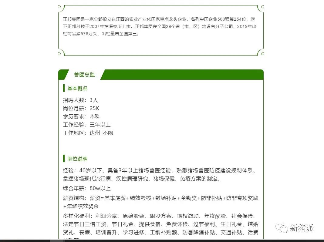 除此之外,正邦科技今年的招聘信息显示,猪场兽医总监的综合年薪达80万元以上......在当今养猪业,只要你有能力,年薪百万似乎已经不再是难事了。