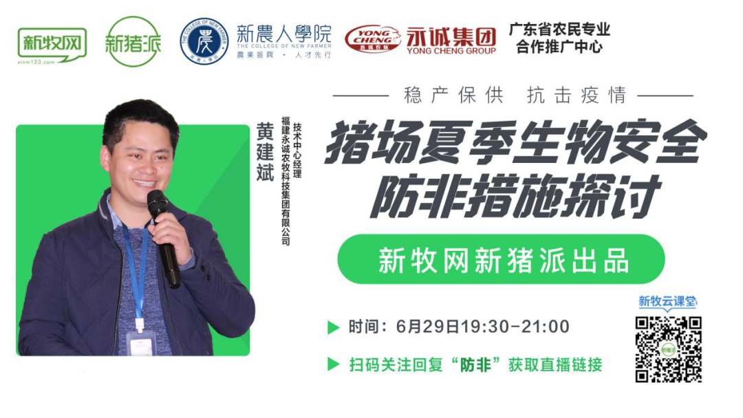 据此,永诚集团技术中心经理黄建斌将于6月29日19:30-21:00,做客新牧云课堂,与广大养猪朋友一起探讨分享猪场夏季生物安全防非措施。扫码关注“新猪派”,回复“防非”获取直播链接。