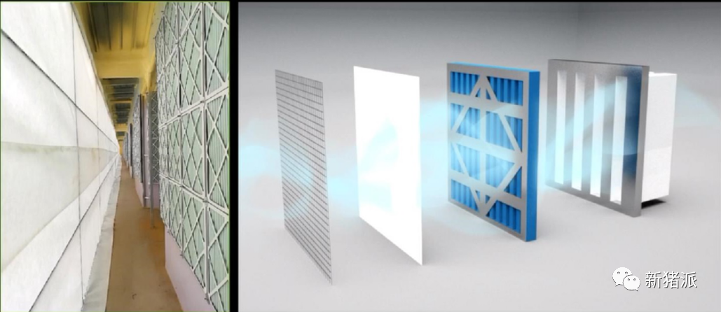 废气处理通过每个楼房单体中间的风井过滤膜排出。每一栋单体由A+B栋组成,共计出栏10万头。A栋与B栋之间大概有10来米左右的间距,用于排放废气