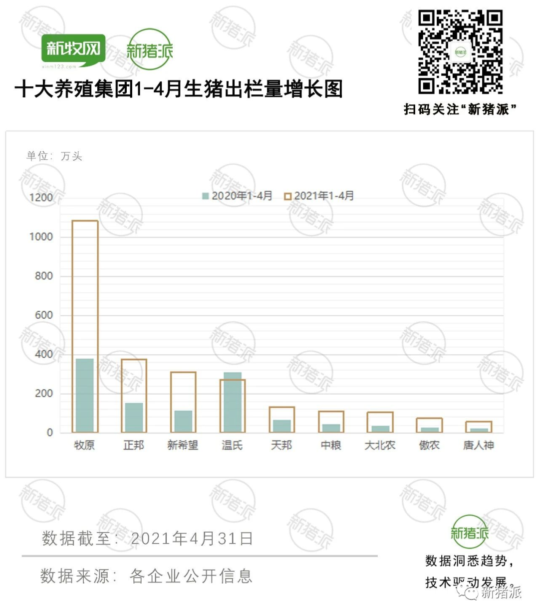 进入5月以来生猪价格再创新低。农业农村部近日透露,目前全国生猪生产加快恢复,市场供应进一步改善,价格不断回落,今后一个时期猪肉供应将呈现总体宽松的趋势。据新牧网新猪派统计,今年前4月,十大猪企生猪出栏总量为2576万头,同比增长118%。